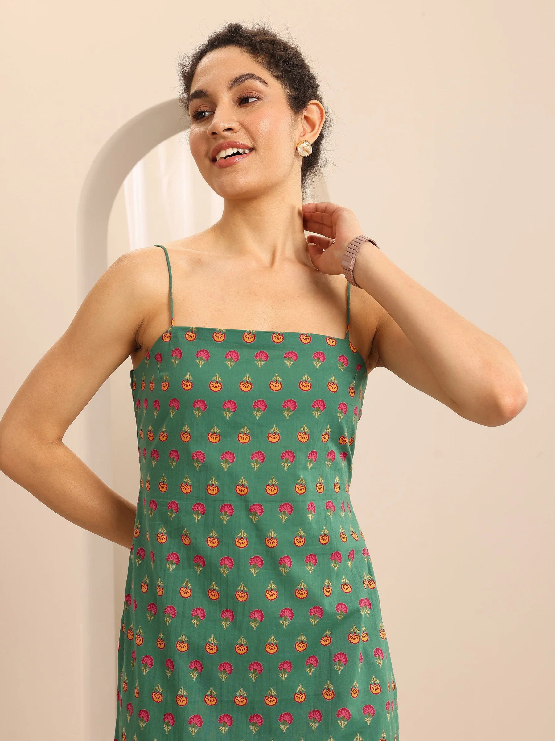 Green Printed Cotton Blend Straight Short Kurti