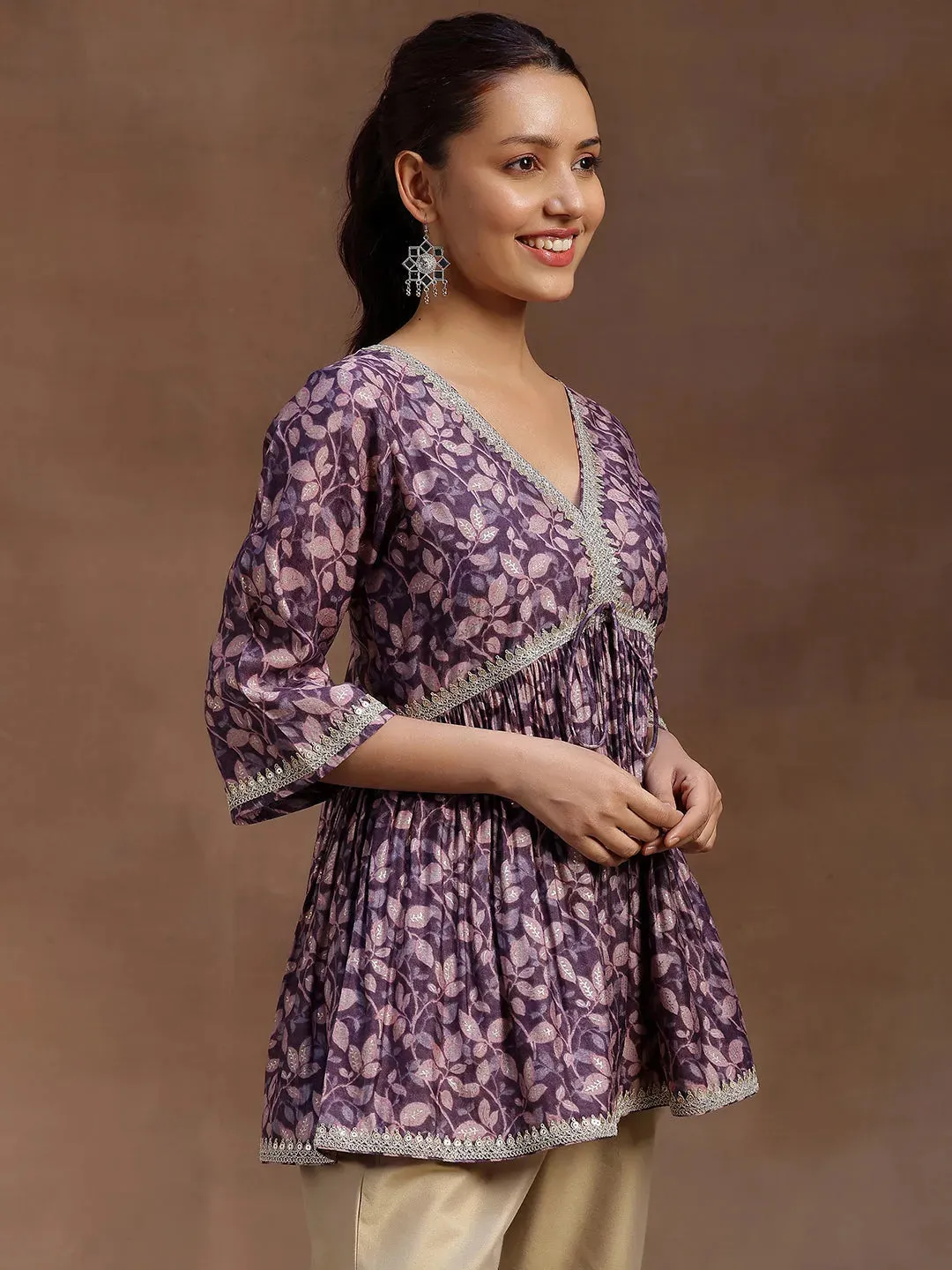 Purple Printed Silk Blend A-line Kurti